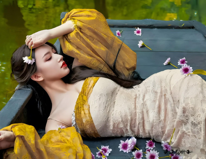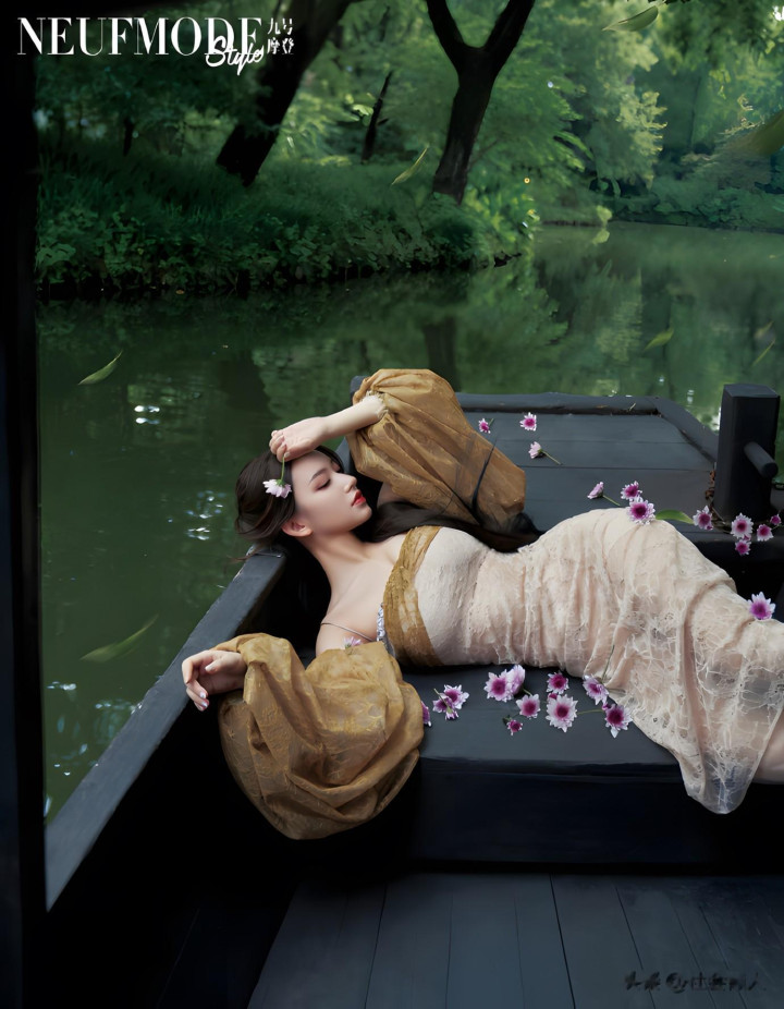 主体温柔色调的杏白色蕾丝连衣裙搭配香槟黄薄纱袖,靠在船头用粉研菊在身边点缀。