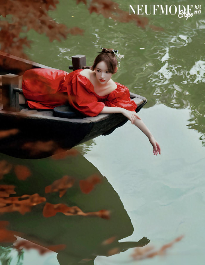 红色露肩长裙勾勒出柔美的肩部线条,在周围的绿波与红叶的衬托下更加艳丽。